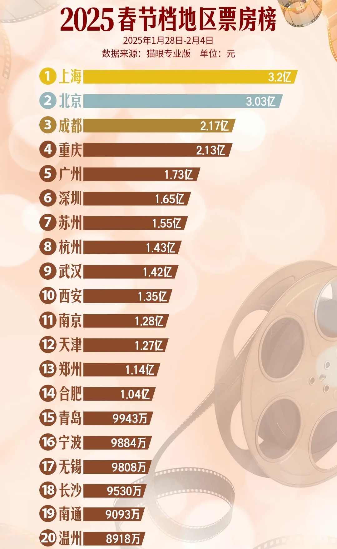 与此同期,本年春节档十大电影票仓城市名单也崇拜出炉,分别是上海、北京、成王人、重庆、广州、深圳、苏州、杭州、武汉和西安。敬爱敬爱的是,这十大票仓城市与2024年世界GDP十强城市高度重合,仅南京被西安取代。2024年GDP总量前十的城市纪律为:上海、北京、深圳、重庆、广州、苏州、成王人、杭州、武汉和南京,以上十城2024年GDP总量至少在1.85万亿元以上。这一征象不仅响应了电影阛阓的高贵,也揭示了城市经济发展与文化生涯之间的精细关系。