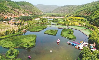 陕西延安南泥湾是宇宙驰名红色旅游方向地。频年来,南泥湾湿地生态系统和野天真植物栖息环境显着改善。夏季时节,青山绿水和成片稻田组成一幅陕北“好江南”的瑰丽画卷。图为旅客在南泥湾国度湿地公园内游玩。 新华社记者 李贺 摄