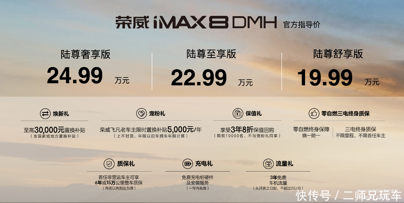 这次,荣威iMAX8 DMH新陆尊共推出3款车型,官方零卖价19.99-24.99万元。针对荣威老车主推出行业最强“以旧换新”置换补贴,笔据拥车时长享5,000元/年的置换金,上不封顶(不含陆尊舒享版);同期,为新车主带来3年8折保值回购,拥车费本低至31元/天。