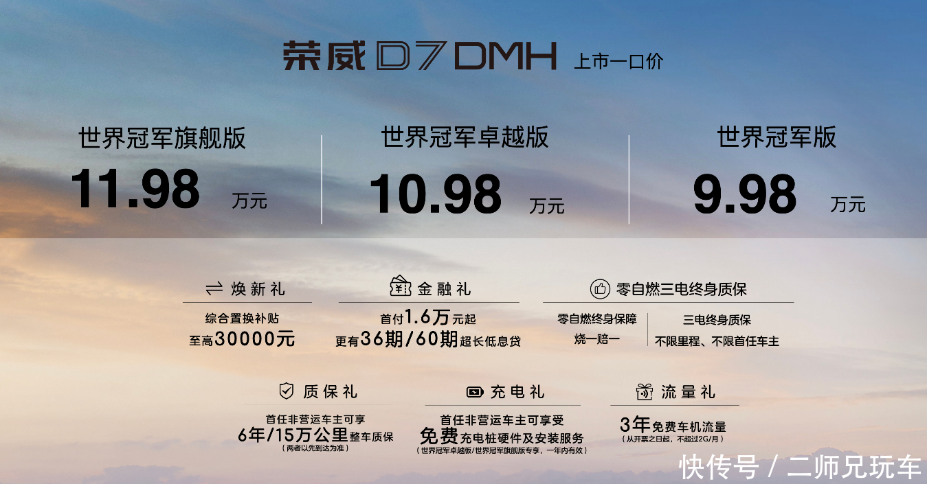 荣威D7 DMH宇宙冠军版共推出3款车型,官方零卖价12.38-14.38万元,全系限时享24,000元现款优惠,一口价低至9.98万元起。双车均享至高30,000元置换补贴,以超值权利带来进阶的价值体验。