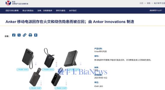 近日,好意思国耗尽者居品安全委员会(简称:好意思国CPSC)发布公告称,Anker挪动电源因存在失火和烧伤隐患调回约48.1万个充电宝。据悉,面前安克立异已收到33生气灾和爆炸事故说明,其中4东谈主轻度烧伤,1东谈主严重财产蚀本。