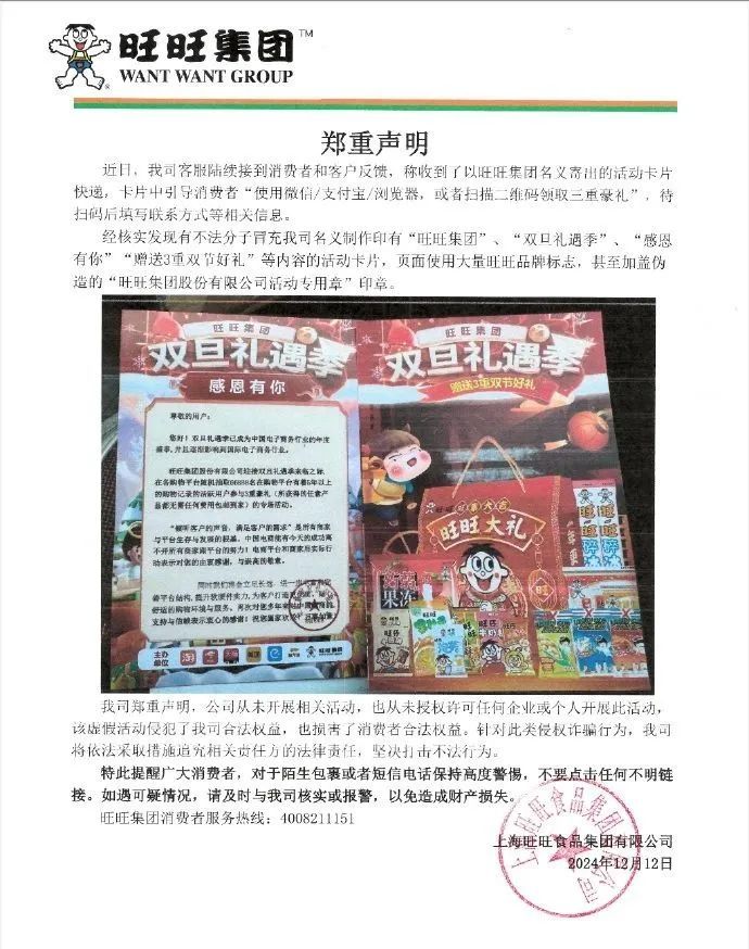 12月13日,旺旺集团官方账号@旺仔俱乐部 发布贵重声明称,“有违警分子冒充我司花式制作印有‘旺旺集团’‘双日礼遇季’‘感德有你’‘扶持3重双节好礼’等本色的手脚卡片,页面使用大批旺旺品牌符号,其至加盖伪造的‘旺旺集团股份有限公司手脚专用章’钤记。”