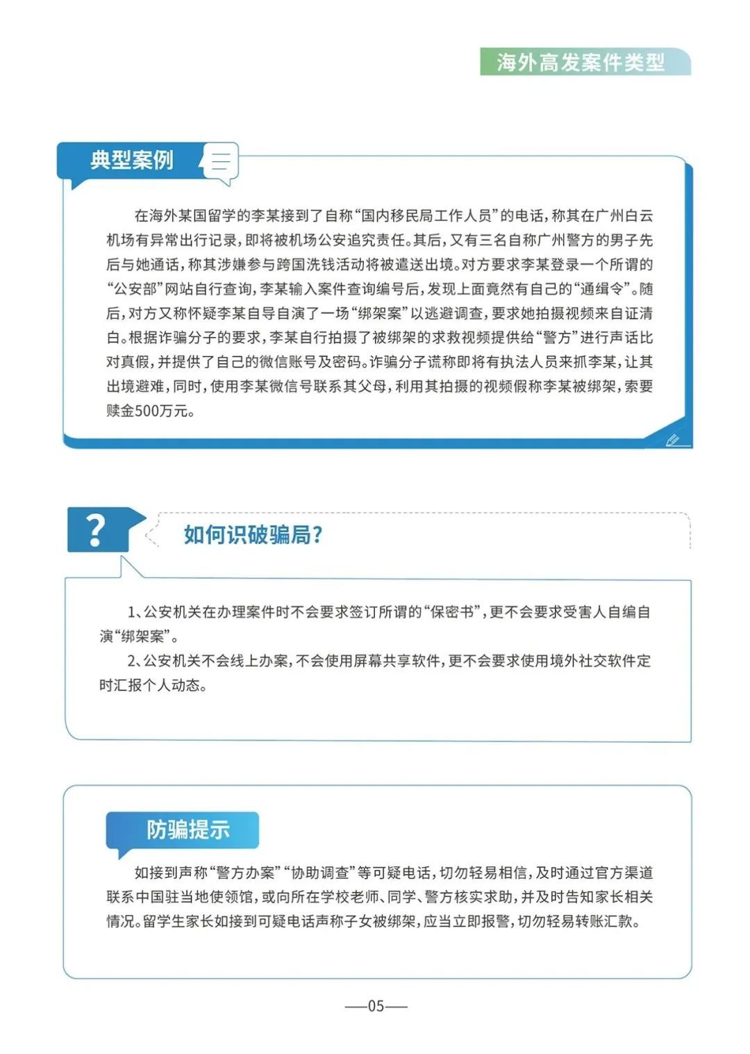 昨年7月,酬酢部领事保护中心曾联结国度反诈中心、教诲部留学做事中心发布《国外小心电信汇注诳骗宣传手册》,其中清点了多种国外高发诳骗类型。
