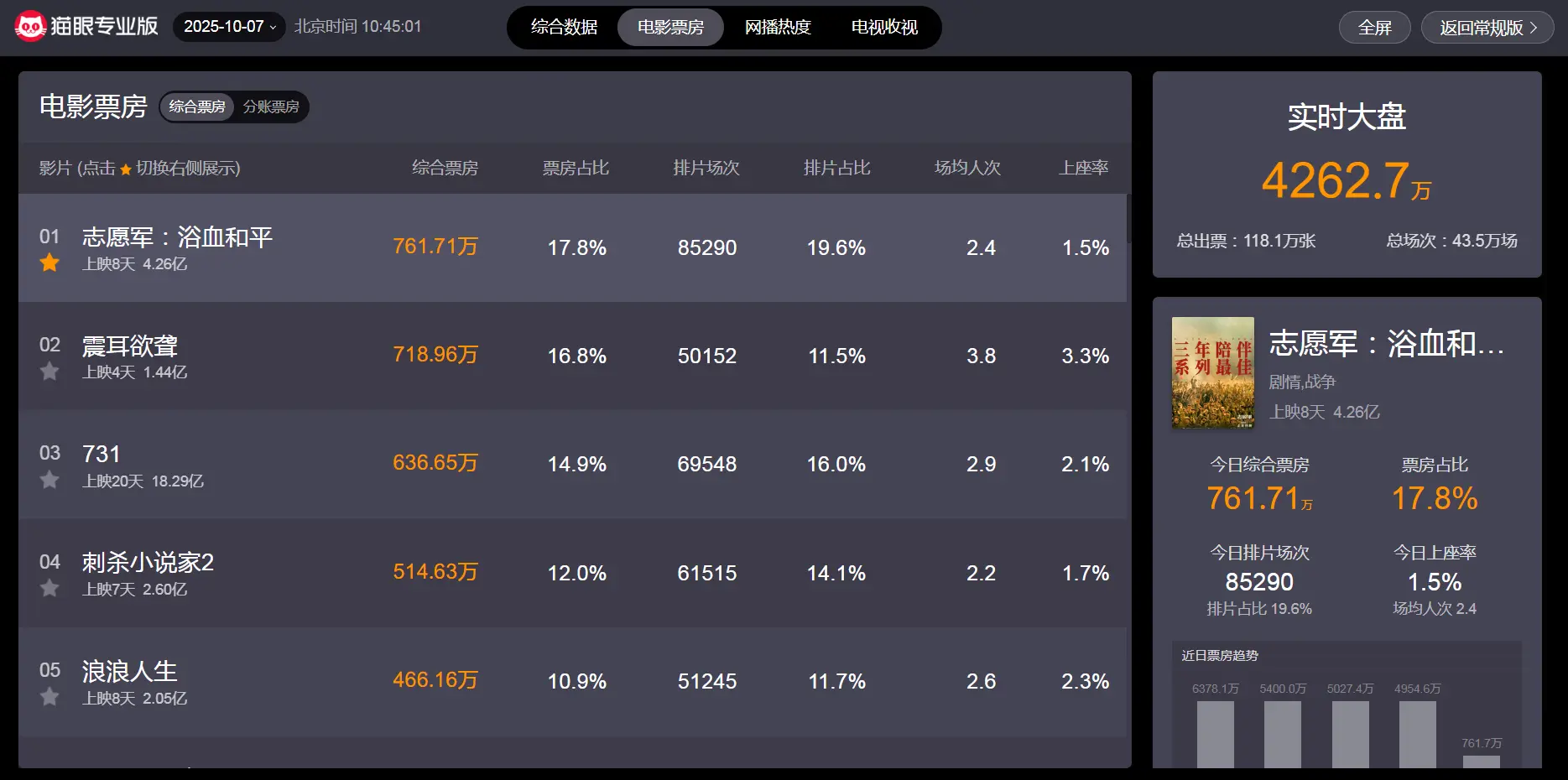 适度10月7日中午10时45分,从“猫眼专科版”及时数据泄露可知,刻下热映电影中,票房榜前五永别如下: