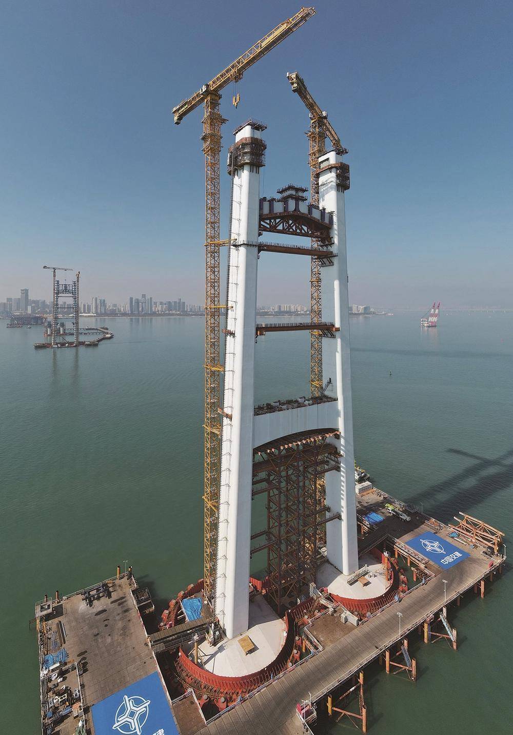 站在施工船上仰望,主塔犹如由数十个巨型银色“积木”垒成。这些“积木”实为预制的钢壳节段,在工场完成制造后,经海运抵达现场,由“二航超卓”号起重船吊至高空拼接。