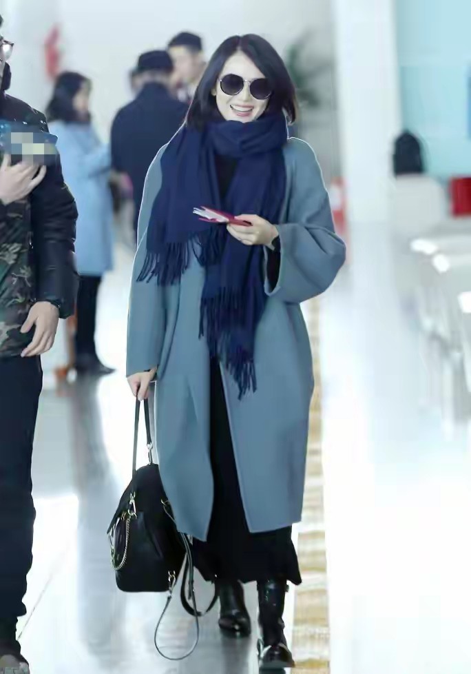 我们先来看一下国民女神高圆圆的大衣穿搭,用一件灰色大衣搭配玄色的连衣裙,加上一条相比有质感的领巾,这样的机场穿搭照实很可以。