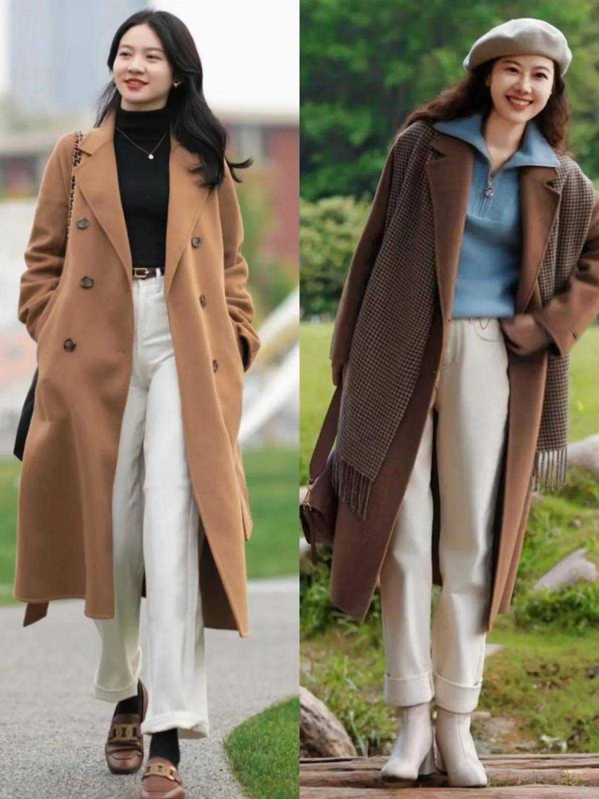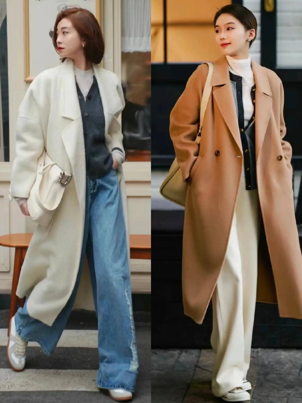 还不如像杭州,上海的前锋博主们用一件白色大衣搭配上玄色的直筒长裤来的雅瞻念。