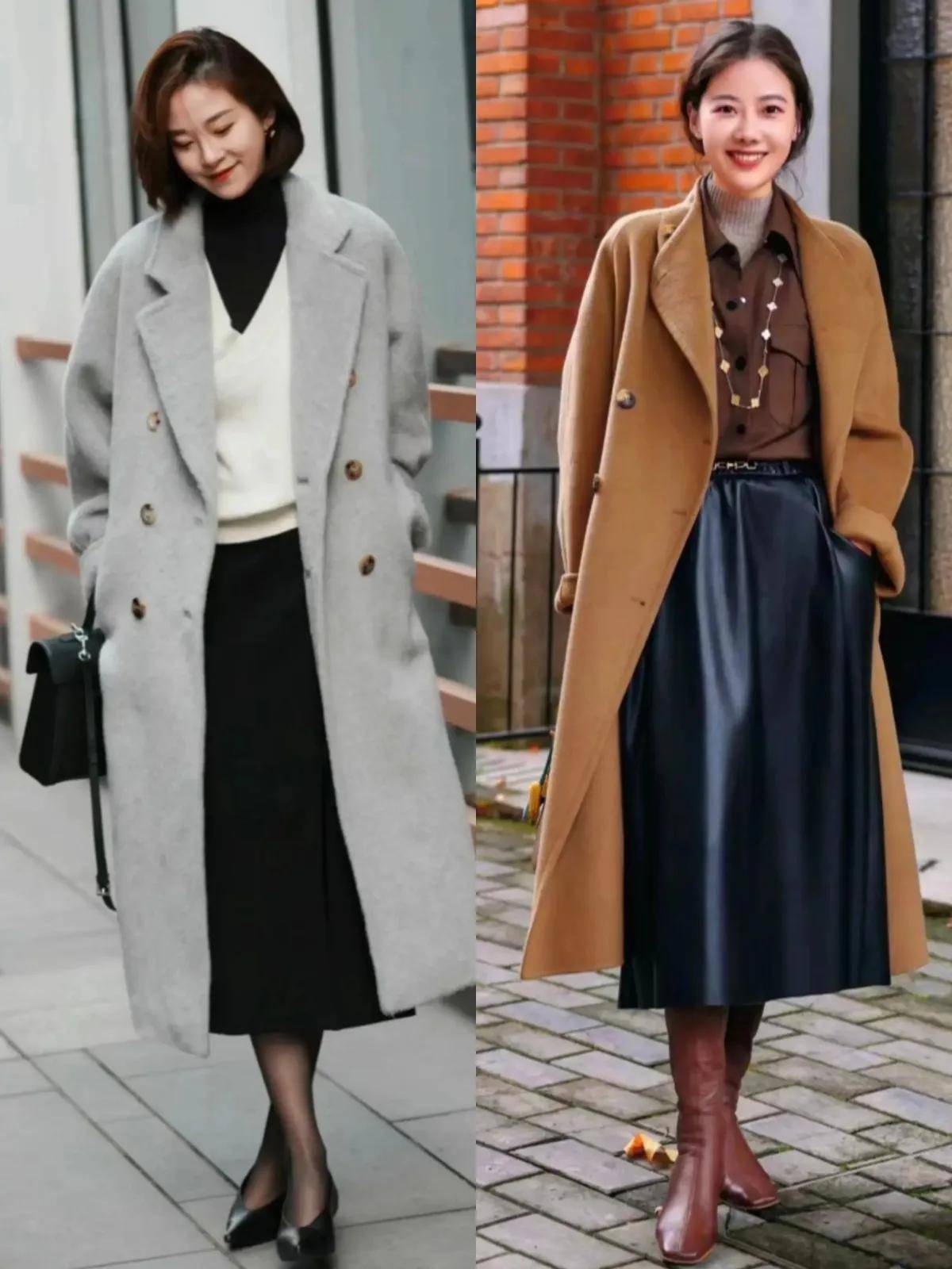 要是你果真要遴聘任裙子来搭配上大衣,那么神情材质一定要上档次,举例上头这一条玄色的皮质半身裙,穿在身上就有一种尽头酷的元素,搭配上一件驼色大衣外衣,那种又飒又好意思的气质就有了。