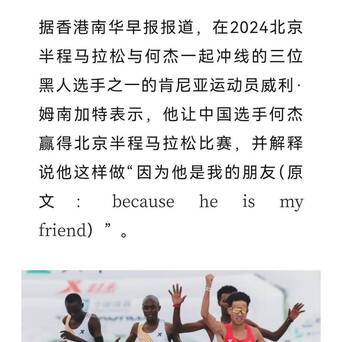 【肯尼亚融会员承认让何杰夺冠】据香港南华早报报谈,在2024北京半程马拉松与何杰一齐冲线的三位黑东谈主选手之一的肯尼亚融会员威利·姆南加特示意,他让中国选手何杰获得北京半程马拉松比赛,并诠释注解说他这么作念“因为他是我的一又友(原文:because he is my friend)”。